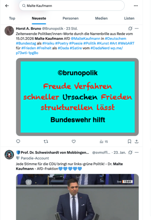 Die Mehrzahl der Worte in dem Poetry-Text „Bundeswehr hilft“ wurde der Rede vom 15.01.2026 des Bundestagsabgeordneten Malte Kaufmann AfD entnommen.
