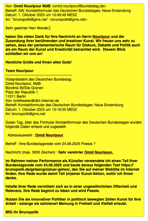 Die Mehrzahl der Worte in dem Poetry-Text „Gefängnistür gehen“ wurde der Rede vom 24.06.2025 des Bundestagsabgeordneten Omid Nouripour DIE GRÜNEN entnommen.