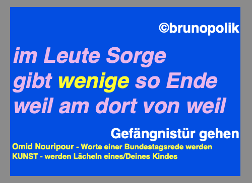 Gefängnistür gehen 18. September 2025 500 × 364 Gefängnistür gehen Screenshot einer Haiku-Strophe aus dem Poetry-Text der PolitikerInnen-Worte mit dem Titel „Gefängnistür gehen“, gebaut aus der Rede vom 24.06.2025 des Bundestagsabgeordneten Omid Nouripour DIE GRÜNEN. Teilen mit: Klicken zum Ausdrucken (Wird in neuem Fenster geöffnet) Drucken Klick, um auf Facebook zu teilen (Wird in neuem Fenster geöffnet) Facebook Klicke, um auf X zu teilen (Wird in neuem Fenster geöffnet) X Gefällt mir:Gefällt mir Wird geladen …