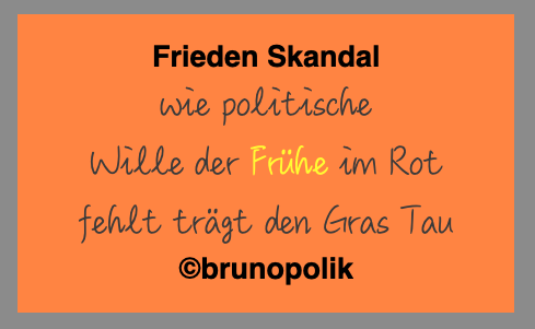 Frieden Skandal 28. Oktober 2025 489 × 301 Frieden Skandal Screenshot einer Haiku-Strophe aus dem Poetry-Text der PolitikerInnen-Worte mit dem Titel „Frieden Skandal“, gebaut aus der Rede vom 17.09.2025 der Bundestagsabgeordneten Charlotte Antonia Neuhäuser DIE LINKE. Teilen mit: Klicken zum Ausdrucken (Wird in neuem Fenster geöffnet) Drucken Klick, um auf Facebook zu teilen (Wird in neuem Fenster geöffnet) Facebook Klicke, um auf X zu teilen (Wird in neuem Fenster geöffnet) X Gefällt mir:Gefällt mir Wird geladen …