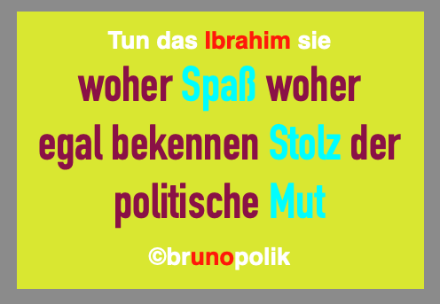 Tun das Ibrahim sie 21. November 2025 496 × 343 Tun das Ibrahim sie Screenshot einer Haiku-Strophe aus dem Poetry-Text der PolitikerInnen-Worte mit dem Titel „Tun das Ibrahim sie“, gebaut aus der Rede vom 12.11.2025 der Bundestagsabgeordneten Sara Nanni DIE GRÜNEN. Teilen mit: Klicken zum Ausdrucken (Wird in neuem Fenster geöffnet) Drucken Klick, um auf Facebook zu teilen (Wird in neuem Fenster geöffnet) Facebook Klicke, um auf X zu teilen (Wird in neuem Fenster geöffnet) X Gefällt mir:Gefällt mir Wird geladen …