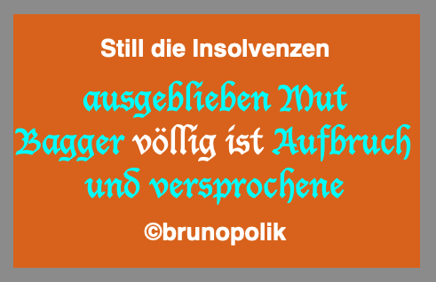 Still die Insolvenzen 15. Dezember 2025 491 × 318 Still die Insolvenzen Screenshot einer Haiku-Strophe aus dem Poetry-Text der PolitikerInnen-Worte mit dem Titel „Still die Insolvenzen“, gebaut aus der Rede vom 27.11.2025 des Bundestagsabgeordneten Sebastian Münzenmaier AfD. Teilen mit: Klicken zum Ausdrucken (Wird in neuem Fenster geöffnet) Drucken Klick, um auf Facebook zu teilen (Wird in neuem Fenster geöffnet) Facebook Klicke, um auf X zu teilen (Wird in neuem Fenster geöffnet) X Gefällt mir:Gefällt mir Wird geladen …