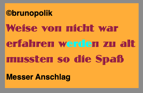 Messer Anschlag 11. Februar 2026 491 × 319 Messer Anschlag Screenshot einer Haiku-Strophe aus dem Poetry-Text der PolitikerInnen-Worte mit dem Titel „Messer Anschlag“, gebaut aus der Rede vom 29.01.2026 des Bundestagsabgeordneten Christian Moser CSU.. Teilen mit: Drucken (Wird in neuem Fenster geöffnet) Drucken Auf Facebook teilen (Wird in neuem Fenster geöffnet) Facebook Auf X teilen (Wird in neuem Fenster geöffnet) X Gefällt mir:Gefällt mir Wird geladen …