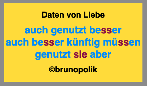 Daten von Liebe 15. Februar 2026 485 × 283 Daten von Liebe Screenshot einer Haiku-Strophe aus dem Poetry-Text der PolitikerInnen-Worte mit dem Titel „Daten von Liebe“, gebaut aus der Rede vom 16.01.2026 der Bundestagsabgeordneten Ronja Kemmer CDU.. Teilen mit: Drucken (Wird in neuem Fenster geöffnet) Drucken Auf Facebook teilen (Wird in neuem Fenster geöffnet) Facebook Auf X teilen (Wird in neuem Fenster geöffnet) X Gefällt mir:Gefällt mir Wird geladen …
