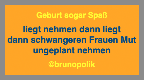 Geburt sogar Spaß 23. Februar 2026 494 × 273 Geburt sogar Spaß Screenshot einer Haiku-Strophe aus dem Poetry-Text der PolitikerInnen-Worte mit dem Titel „Geburt sogar Spaß“, gebaut aus der Rede vom 25.09.2025 der Bundestagsabgeordneten Martina Kempf AfD.. Teilen mit: Drucken (Wird in neuem Fenster geöffnet) Drucken Auf Facebook teilen (Wird in neuem Fenster geöffnet) Facebook Auf X teilen (Wird in neuem Fenster geöffnet) X Gefällt mir:Gefällt mir Wird geladen …