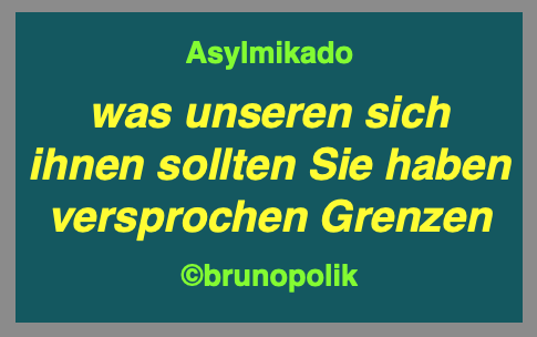 Asylmikado 8. März 2026 485 × 304 Asylmikado Screenshot einer Haiku-Strophe aus dem Poetry-Text der PolitikerInnen-Worte mit dem Titel „Asylmikado“, gebaut aus der Rede vom 26.02.2026 des Bundestagsabgeordneten Stefan Möller AfD.. Teilen mit: Drucken (Wird in neuem Fenster geöffnet) Drucken Auf Facebook teilen (Wird in neuem Fenster geöffnet) Facebook Auf X teilen (Wird in neuem Fenster geöffnet) X Gefällt mir:Gefällt mir Wird geladen …