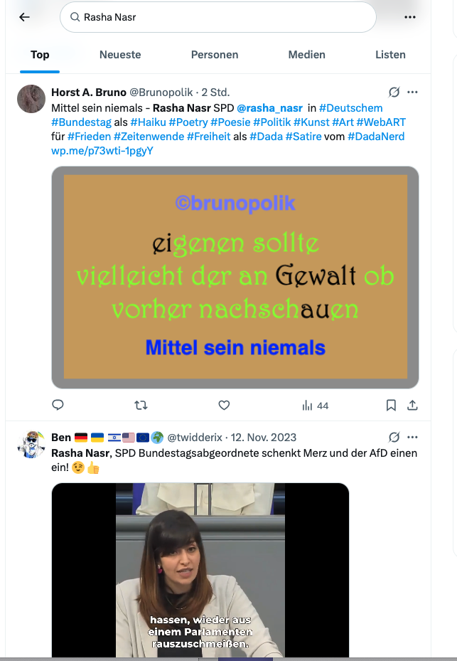Twitter – Rasha Nasr – SPD Bundestagsabgeordnete 15. November 2025 643 × 929 Mittel sein niemals Screenshot Twitter – Rasha Nasr – SPD Bundestagsabgeordnete Teilen mit: Klicken zum Ausdrucken (Wird in neuem Fenster geöffnet) Drucken Klick, um auf Facebook zu teilen (Wird in neuem Fenster geöffnet) Facebook Klicke, um auf X zu teilen (Wird in neuem Fenster geöffnet) X Gefällt mir:Gefällt mir Wird geladen …